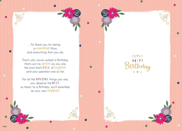 Wish your Mum happy birthday with this striking Mum birthday card. This Mum birthday card uses a bright gold hot foil finish in its colourful design. This Mum birthday card is printed on high quality board and is designed and printed in the UK and uses hot foil finish to give it a special finish. Inside this Mum birthday card is a full colour insert with a long verse.