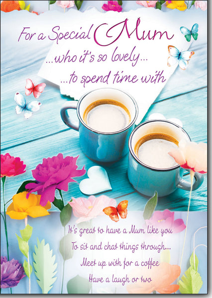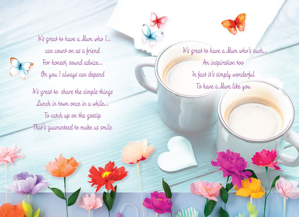 Wish your Mum happy birthday and let her know how much she is loved and appreciated with this lovely Mum birthday card. This Mum birthday card features a photographic hot coffee and flowers design with a glitter finish. This Mum birthday card is printed on high quality board with a glitter finish and full colour insert. This Mum birthday card has a beautiful verse to let your Mum know how much she is thought of. This Mum birthday card is designed and printed in the UK.