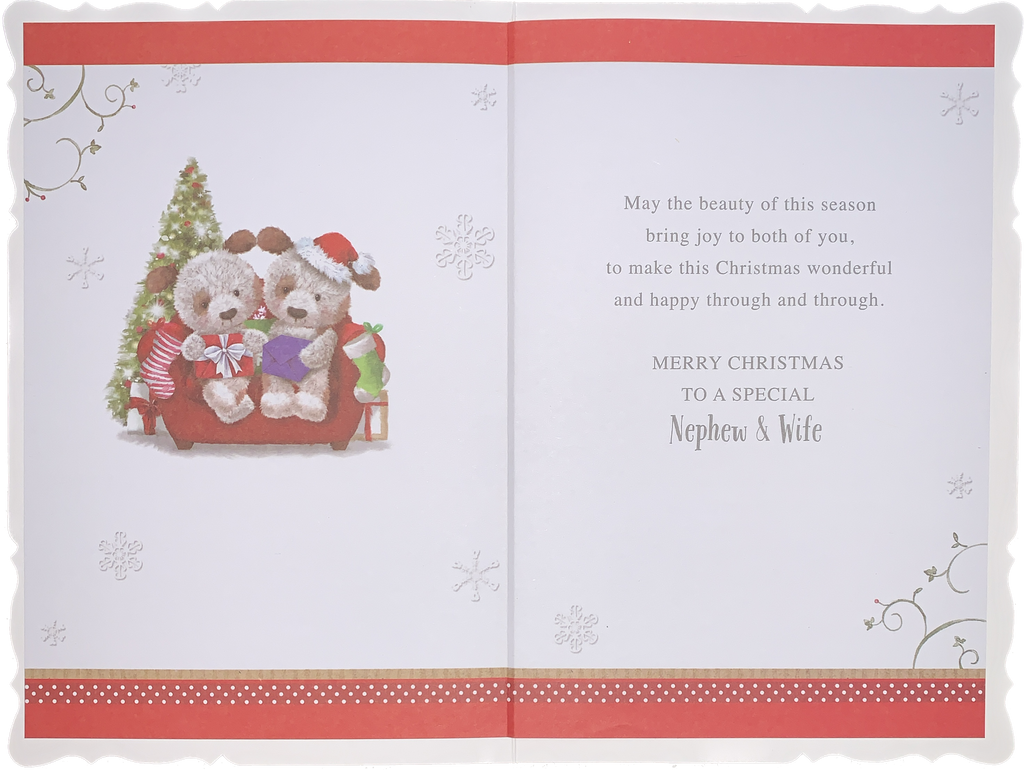 Send your Nephew and his Wife this charming card for Christmas. Boasting a festive design with cuddling canines on a comfy sofa, this Nephew and Wife card is set off with a bright red foil finish. The full-colour insert provides additional seasonal detail.