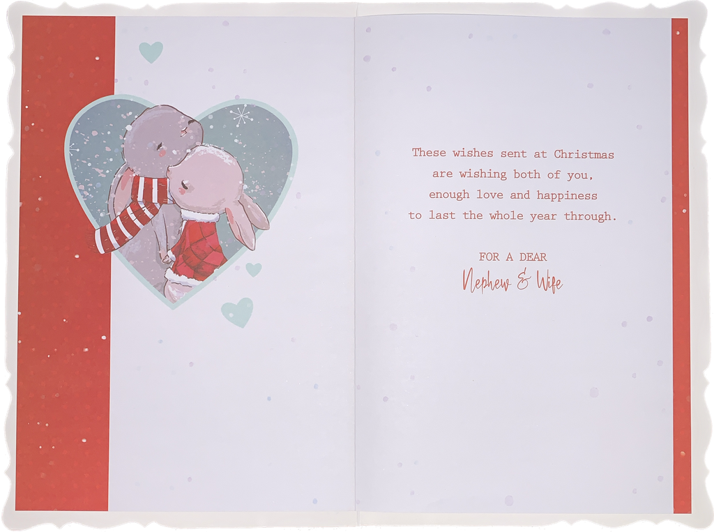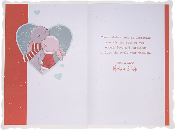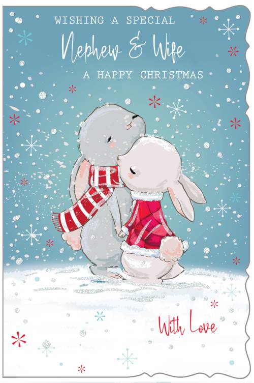 Wish your Nephew and his Wife merry Christmas with this cute Nephew and Wife Christmas card. This Nephew and Wife xmas card features a cute Christmas rabbits design. This cute Nephew and Wife Christmas card has a glitter finish and full colour insert. This nephew and wife Christmas card is designed in the UK.