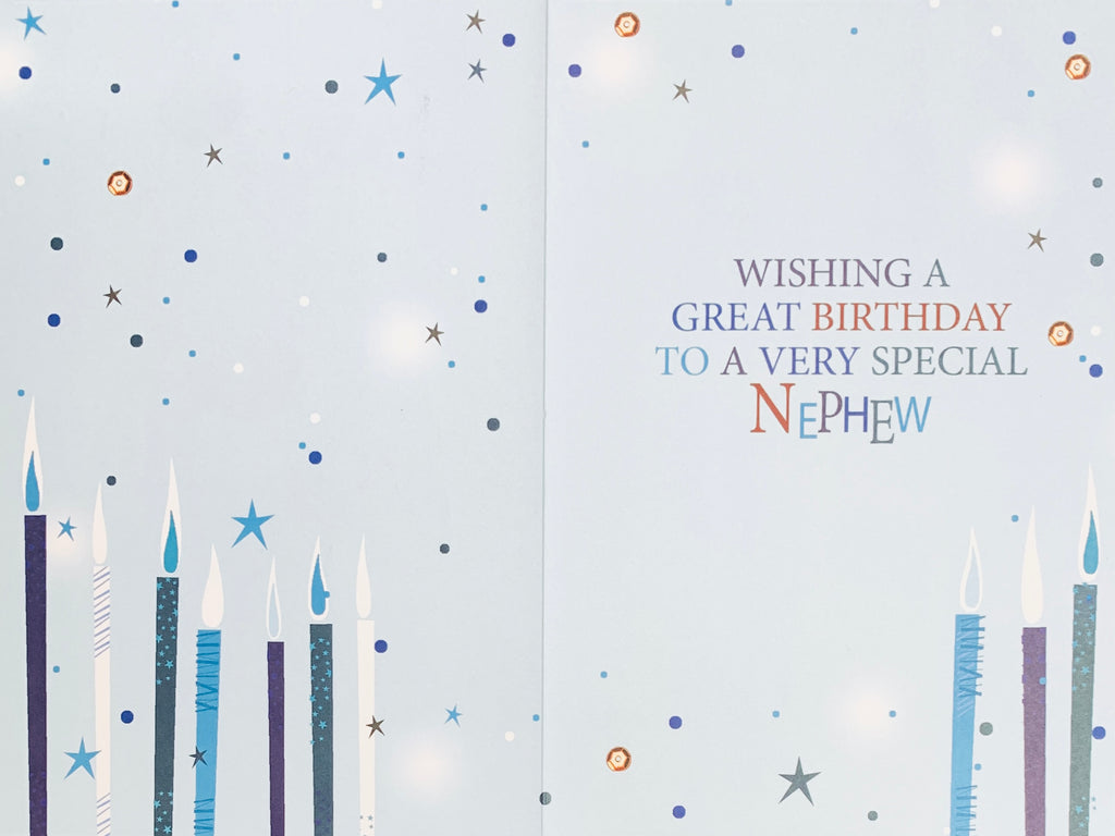 Wish your Nephew happy birthday with this Nephew birthday card. This Nephew birthday card features a contemporary birthday candles design with a gold foil finish and full colour print inside