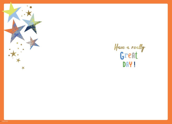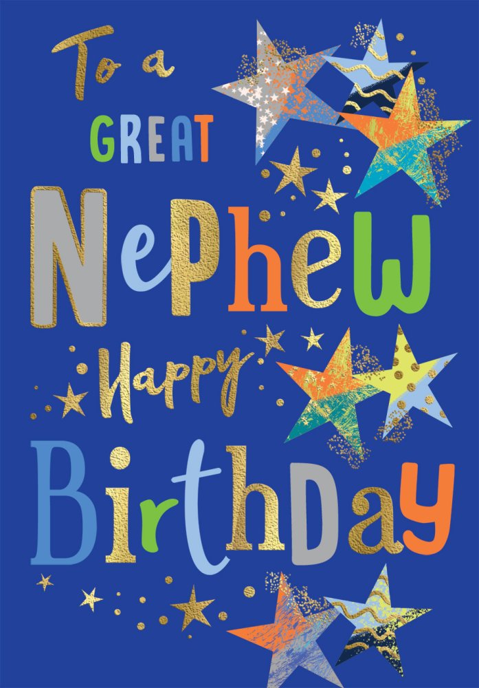 Send happy birthday wishes to a great nephew with this modern nephew birthday card. This nephew birthday card features a modern stars design and gold foil finish. Inside this greeting card is a full colour insert.