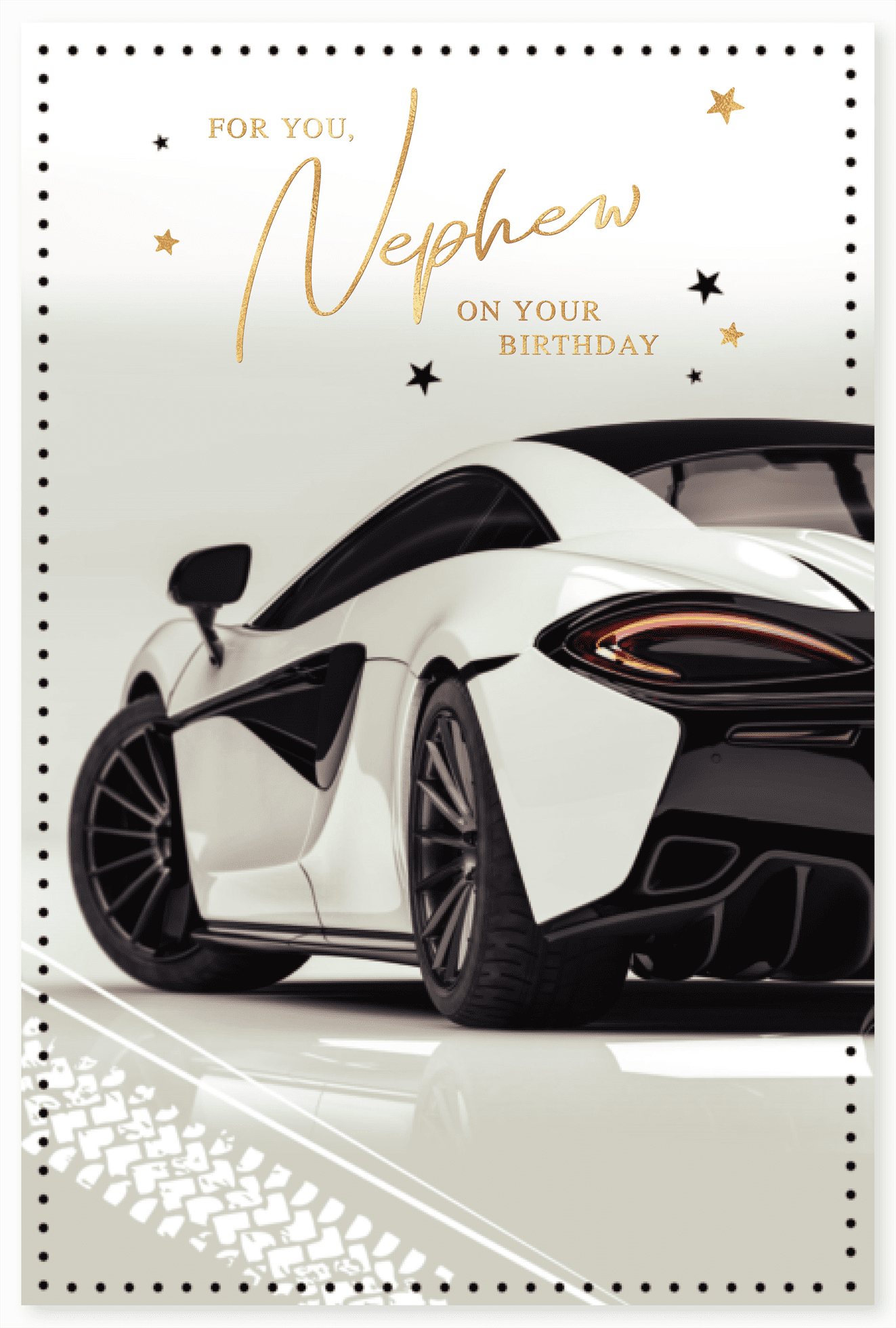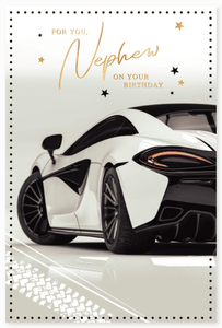 Celebrate your Nephew’s birthday with this traditional Nephew birthday card. This Nephew birthday card features a traditional sports car design and has a hot foil finish. This Nephew birthday card has a full colour print inside.