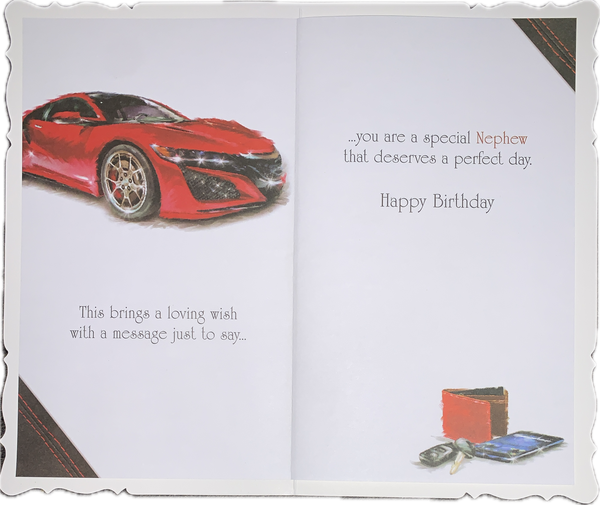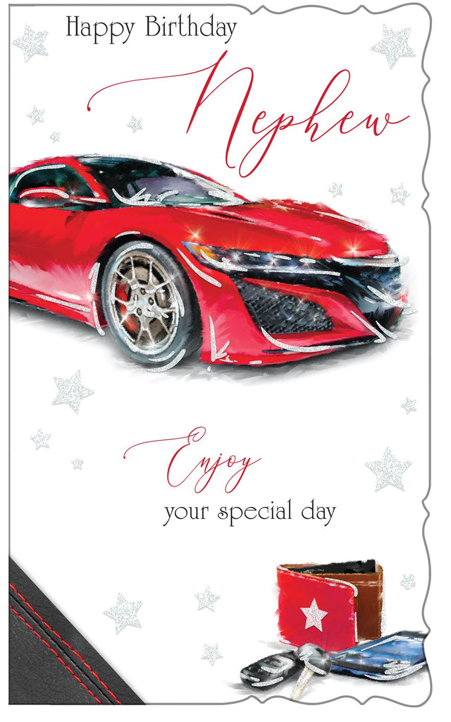 Celebrate your Nephew's special day with this classic Nephew birthday card. The card showcases a timeless sports car design and is accented with sparkling glitter. Inside, you'll find a vibrant full-colour insert that adds an extra touch of charm.