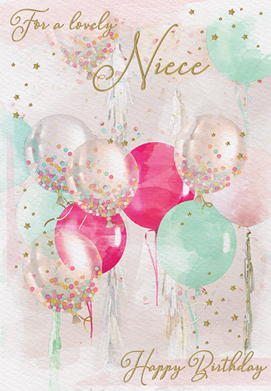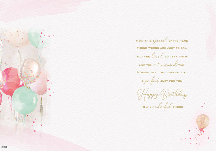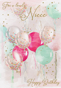 Wish your Niece happy birthday with this beautiful Niece birthday card. This Niece birthday card features a beautiful balloon design in soft pastel colours. This Niece birthday card features a hot foil finish with a full colour insert. This Niece birthday card is printed on high quality board and is designed and printed in the UK.