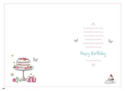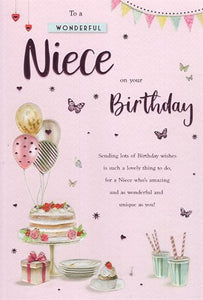 Wish your Niece happy birthday with this lovely Niece birthday card. This Niece birthday features a lovely traditional birthday cake and balloons design. This Niece birthday card is printed on high quality board and is designed and printed in the UK and uses hot foil and glitter to give it a special finish. Inside this Niece birthday card is a full colour insert with a medium length verse.