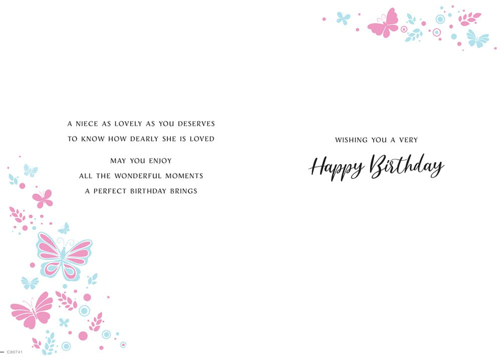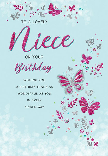 Wish your Niece a sensational birthday with this contemporary Niece birthday card! Boasting a stunning sparkling butterfly design, this greeting card has a vibrant hot foil and glitter finish with a full-colour insert. All printed in the UK, this Niece card is sure to make their day extra special!