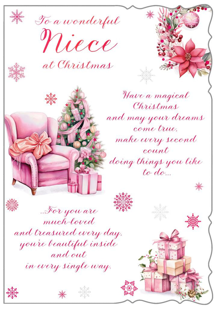 Wish your Niece a lovely Christmas with this traditional festive Niece Christmas card. This Niece Christmas card features a classic Christmas home design. This Niece Christmas card has a red foil finish and full colour print inside. This greeting card is designed in the UK.