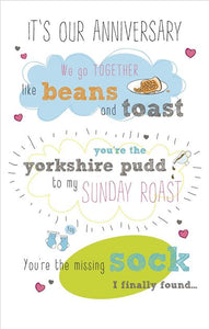 Wish your Partner, Husband or Wife a happy anniversary with this funny our anniversary greeting card. This Our anniversary greeting card features a funny design with hot foil finish and full colour print inside. This Our anniversary card is made in the UK and is produced on high quality board sourced from environmentally responsible resources.