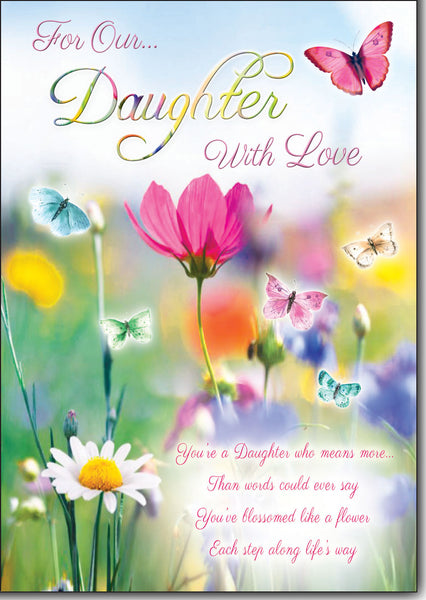 Celebrate your daughter's birthday with this sentimental our daughter card. The card features a classic butterfly and flowers design, printed on premium board with a glitter finish and full color insert. Inside, you'll find a heartfelt verse to express your love and best wishes on her special day.