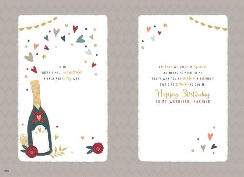 Wish your Partner a very happy birthday with this eye catching Partner birthday card. This partner birthday card features a modern birthday drinks design. This Partner birthday card is printed on high quality board with a bold gold foil finish and full colour insert. This greeting card is designed and printed in the UK and is produced with environmentally responsible sourced materials.