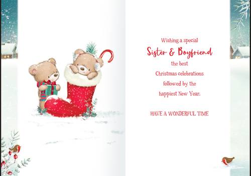 Wish your Sister and her boyfriend a very merry Christmas and let them know they are being thought about with this cute Sister and boyfriend Christmas card. This cute Sister and Boyfriend Christmas card features a cute bears design. This Sister and Brother-in-law Christmas card has a glitter finish and full colour insert. This greeting card is designed in the UK.