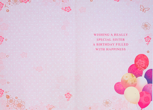 Send your Sister a heartfelt greeting with this traditional Sister birthday card. This card boasts a birthday balloons and flowers design adorned with stunning gold foil, completed with a full-colour insert.