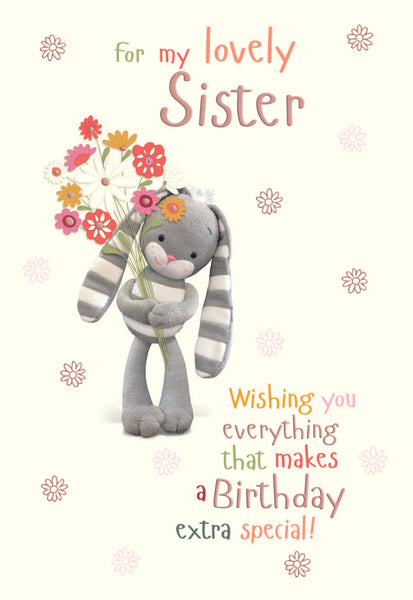 Sister birthday card - cute rabbit holding flowers- Hun Bun