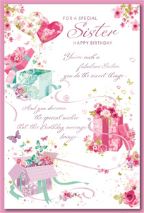 Celebrate your Sister’s birthday with a traditional Sister birthday card. This traditional Sister birthday card features a present and flowers design and has a hot foil finish. This Sister birthday card has a full colour insert. Short verse.
