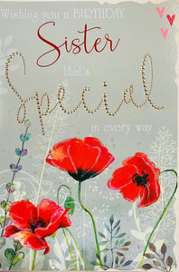 Wish your Sister a happy birthday with this lovely Sister birthday card. This traditional Sister birthday card features a bold Poppy floral design. This Sister birthday card has a hot foil and glitter finish. This birthday card for Sister has a full colour insert. This greeting card is designed in the UK.