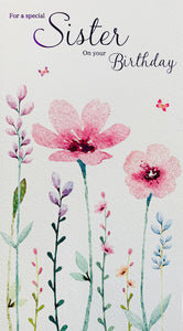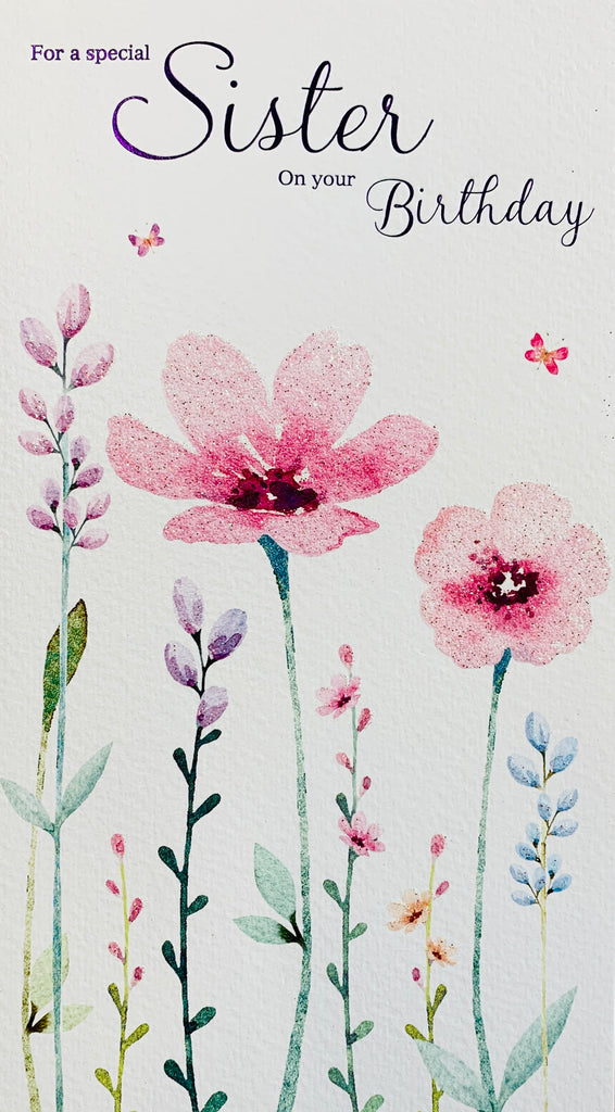 Wish your Sister happy birthday with this beautiful Sister birthday card. This Sister birthday card features a beautiful floral design. This Sister birthday card is printed on high quality board with hot foil finish and glitter finish. This greeting card has a full colour insert. This Sister birthday card is designed and printed in the UK.
