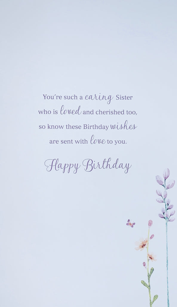 Verse reads: You’re such a caring sister who is loved and cherished too, so know these birthday wishes are sent with love to you. Happy birthday.