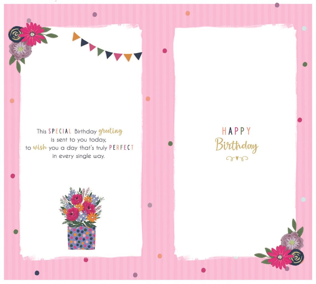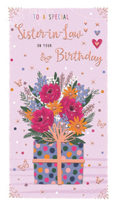 Send warm wishes to a special Sister-in-law with this birthday card, featuring an elegant flower design. Printed on premium card stock with a gleaming gold foil finish and full-colour insert, this card is a British-made quality product.