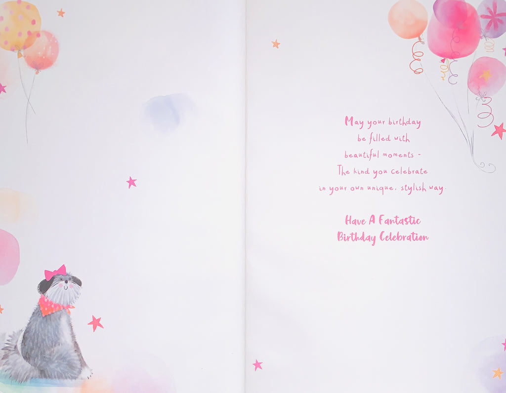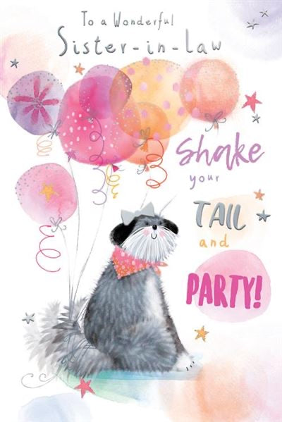 Mark your Sister in law's special day with this sweet Sister in law birthday card adorned with an adorable pup illustration. This charming card is embellished with a hot foil finish and comes with a vibrant full colour insert. This Sister in law birthday card is crafted in the UK.