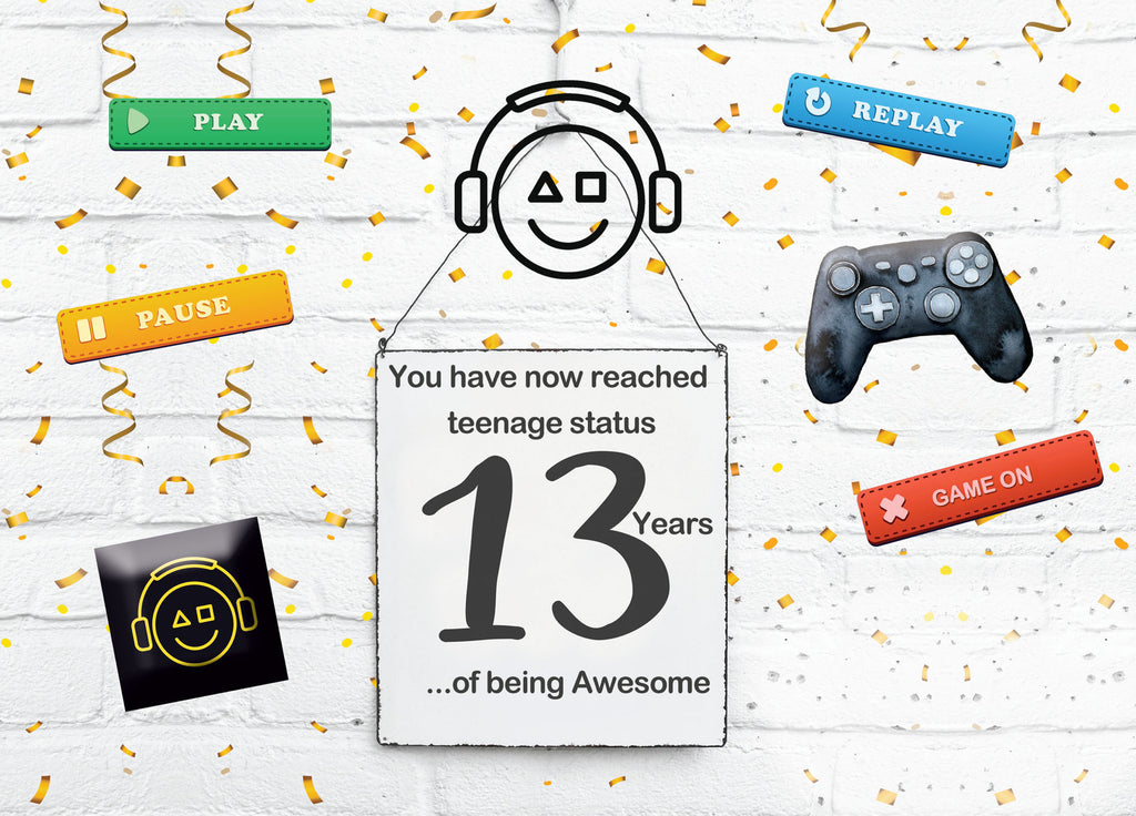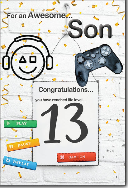celebrate your son becoming a teenager with this son 13th birthday. This Son thirteenth birthday card features a cute gamer design. This greeting card is printed on high quality board with full colour print inside. This 13th birthday card for son is designed and printed in the UK and produced on fully recyclable materials sourced from environmentally responsible sources.