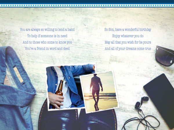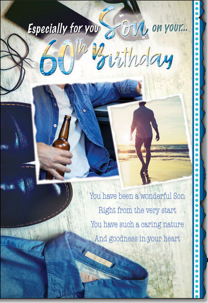 Wish your Son special birthday wishes with this Son 60th birthday card. This Son sixtieth birthday card features a traditional photographic birthday beers and beach design. This Son 60th birthday card is printed on high quality board with a glitter finish and full colour insert. Long sentimental verse. This Son 60th birthday card is designed and printed in the UK.