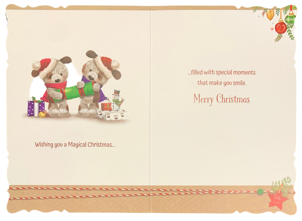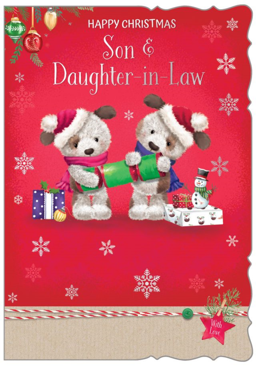 Wish your Son and Daughter-in-law a wonderful Christmas and let them know they are being thought about with this cute Son and Daughter-in-law Christmas card. This cute Son and Daughter-in-law Christmas card features a cute dog couple design. This Son and Daughter-in-law Christmas card has a silver foil finish and full colour print inside. This greeting card is designed in the UK.