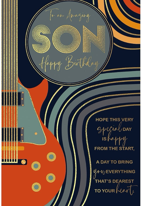 Send your son a special happy birthday wish with this music themed birthday card - boasting a stylish guitar design perfect for a music loving son! This greeting card contains a full-colour interior, with a golden foil finish for an extra touch of class. All designed and printed in the United Kingdom.