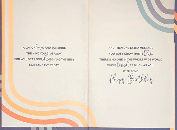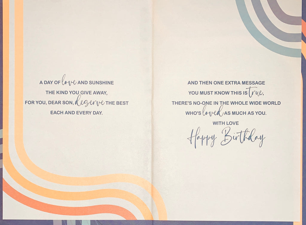 Verse reads: Hope this very special day is happy from the start. A day to bring you everything that’s dearest to your heart. A day of love and sunshine th e kind you give away, for you dear son, deserve the best each and every day. And then one extra message you must know this is true, there’s no-one in the whole wide world who’s loved as much as you. With love. Happy birthday