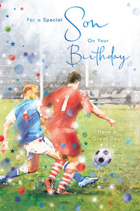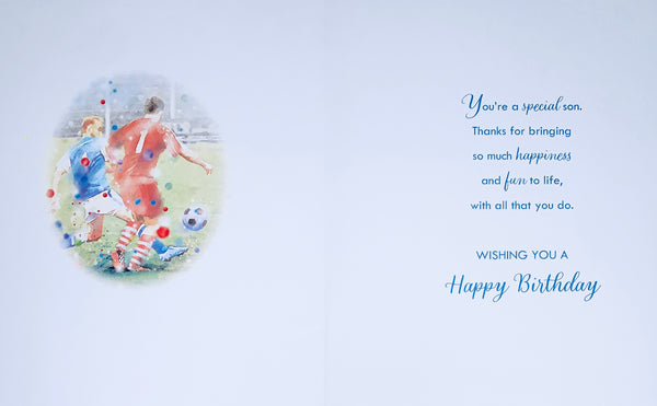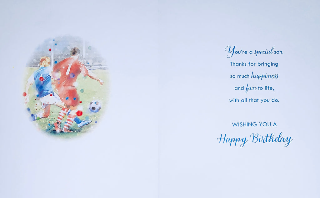 Wish your Son happy birthday with this football inspired Son birthday card. This Son birthday card is the perfect way to wish a footy mad son a happy birthday. Inside this Son birthday card is a full colour insert and the front is decorated with a blue foil finish. This Son birthday card is designed and printed in the UK.