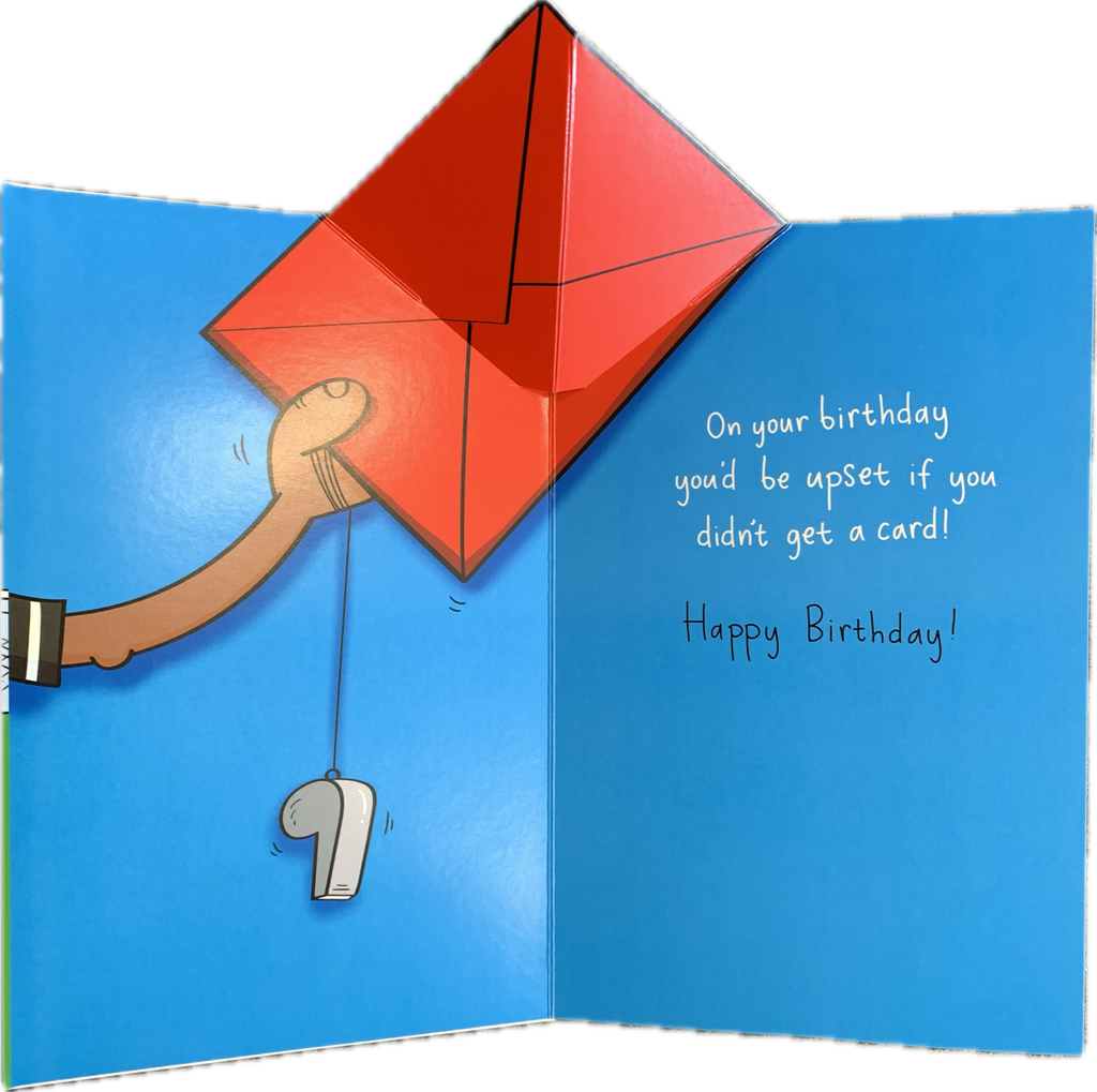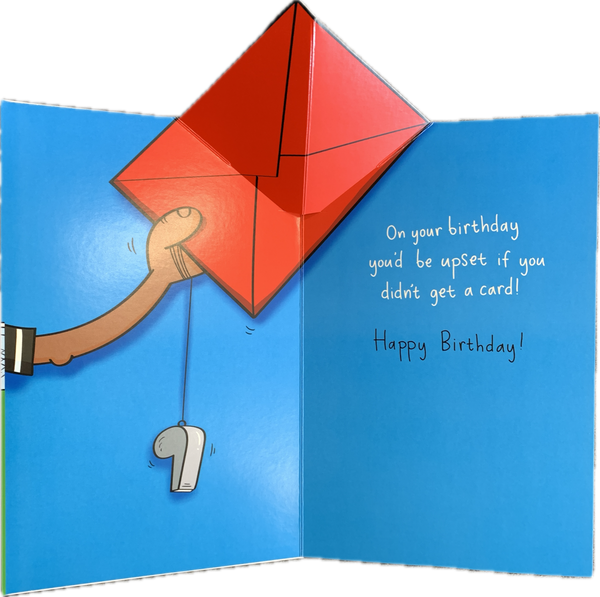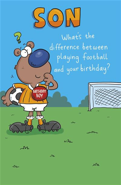 Put a smile on your Son’s face with this funny Son birthday card. This Son birthday card is the perfect card for a footy mad son with its funny football themed design. This Son birthday card has full colour print inside with a red card pop up feature. This greeting card is printed on paper sourced from environmentally responsible sources and is designed and printed in the UK