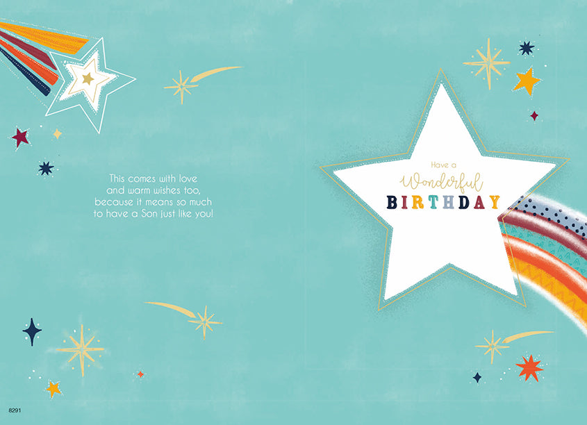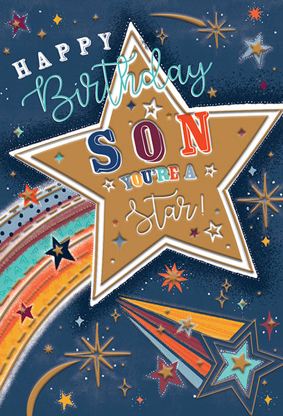 Wish your Son happy birthday with this popular modern Son birthday card. This contemporary Son birthday card is printed on high quality board with a hot foil and glitter finish. This greeting card features a bold colourful shooting stars design. This Son birthday card has a full colour insert. Short verse. This Son birthday card is designed and printed in the UK.