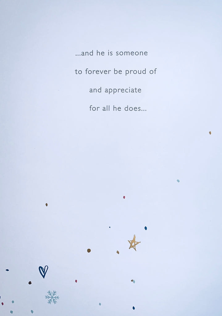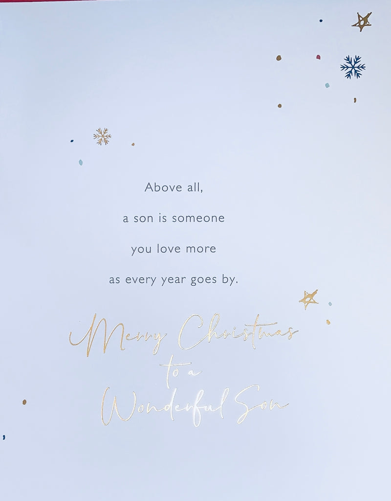 Let your Son know how much he is loved and wish him a wonderful Christmas with this luxury Son Christmas card. This Son Christmas card features a lovely contemporary festive design. This Son Christmas card features a hot foil finish and multiple decorative attachments giving this greeting card a luxury feel. This Xmas card is printed on high quality board with a full colour multi page insert and is designed in the UK