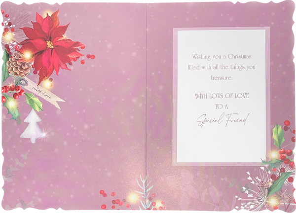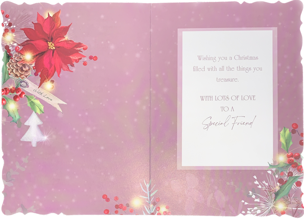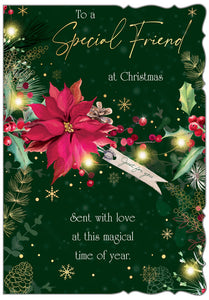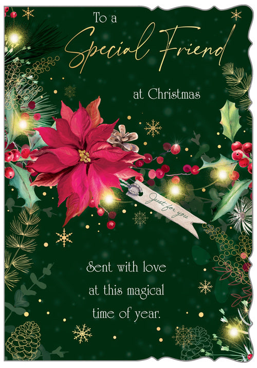 Send your special friend the perfect greeting for the holiday season with this traditional friend Christmas card. Showcasing a festive and traditional floral Christmas design, this card features a gold foil finish and full colour printing on the inside.