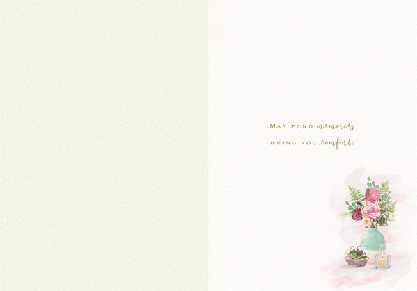 Express your heartfelt condolences during this difficult time with this beautiful sympathy card. The elegant floral heart design and full colour print inside with a heartfelt short verse of remembrance make this traditional sympathy card a thoughtful choice. Crafted with high quality board and a subtle golden foil finish, this sympathy card is designed and printed in the UK.