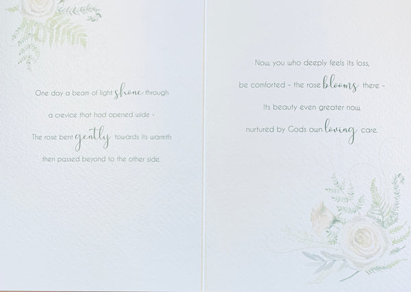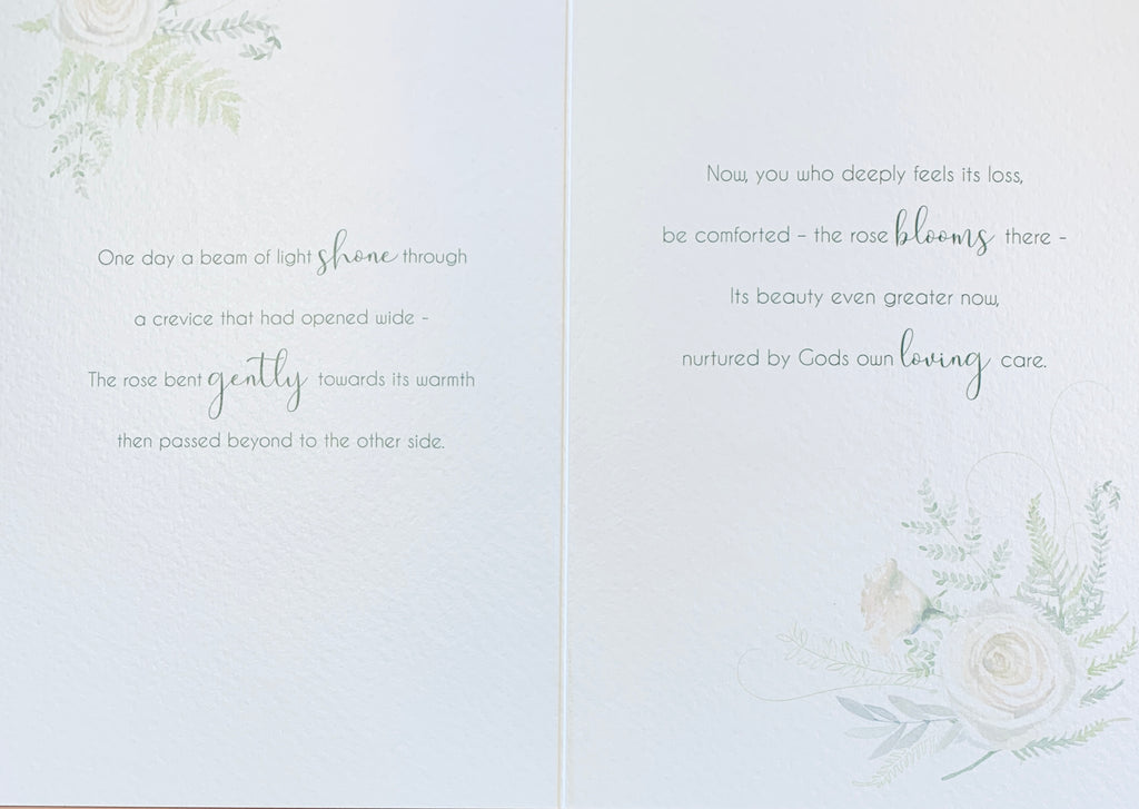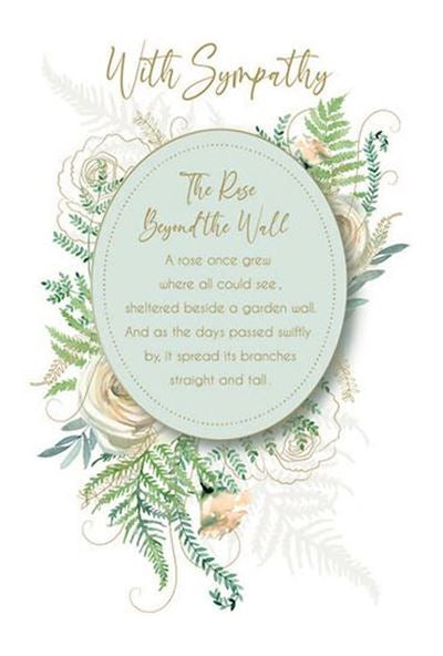 Send your condolences and caring thoughts at this very sad time with this sympathy card. This condolences card features the beautiful “Rose beyond the wall” poem. This sympathy card features a traditional design and is printed on high quality board with a hot foil finish. This greeting card has full colour print inside.