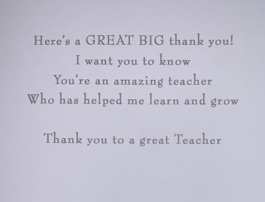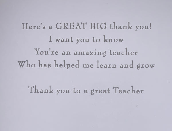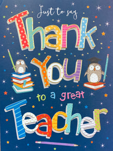 Show your teacher some love with this adorbs Thank You Teacher Card! A cute owl with iridescent foil and glitter hot spots will let them know they're a hoot - surely worth an A++! Crafted in the UK with a full-color insert, it's no surprise this card gets straight A's!