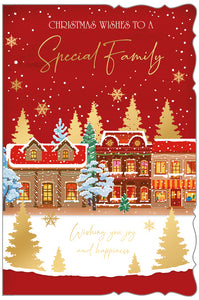 Wish them all a wonderful Christmas with this traditional to all the family Christmas card. This traditional to all the family Xmas card features a classic winter town design. This greeting card has a golden foil finish and a full colour insert.