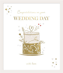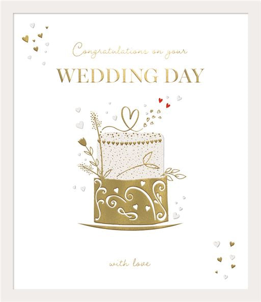 Send your congratulations to the newly married couple with this exquisite wedding card. The card is decorated with a delightful wedding cake design and includes a full-colour insert containing a thoughtful message. Crafted from premium board with an eye catching sumptuous golden foil finish, this card is designed in the UK, and will bring a smile to the newlyweds' faces on their special day.