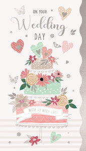 Send your congratulations to the newly married couple with this colourful wedding card. This greeting card is decorated with a delightful wedding cake and flowers design and includes a full-colour insert containing a thoughtful message. Crafted from premium board with an eye catching sumptuous silver foil finish, this card is designed in the UK, and will bring a smile to the newlyweds' faces on their special day.