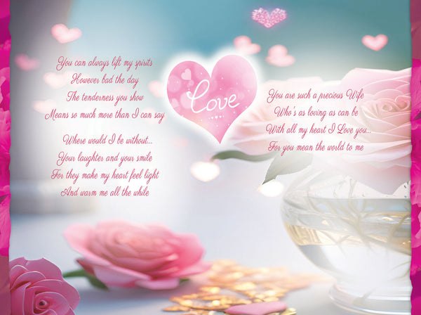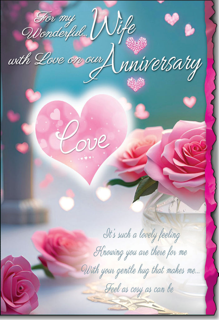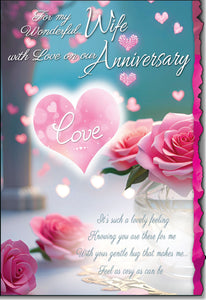 Let your wonderful wife know how much she is loved and appreciated with this beautiful Wife anniversary card. This Wife wedding anniversary card features a beautiful pink roses photographic design. This Wife anniversary card is printed on high quality board with a shimmering glitter finish and full colour insert. Long verse. This Wife anniversary card is designed and printed in the UK.