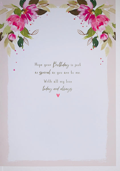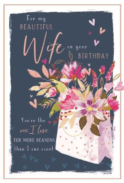 Let your Wife know how amazing she is with this lovely Wife birthday card. This Wife birthday card has a lovely birthday flowers design. This Wife birthday card is printed on high quality board with a lovely rose gold foil finish. This Wife birthday card is designed and printed in the UK. Inside this Wife birthday card is a full colour insert.