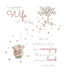 Cute Wife birthday card. Send your wife birthday wishes full of love with this lovely cute Wife birthday card. This cute Wife birthday card features cute bears hugging. This greeting card is printed on a beautiful pearlescent board that shimmers in the light with a hot foil finish. This Wife birthday card is designed and printed in the UK. This birthday card for Wife has a full colour insert.