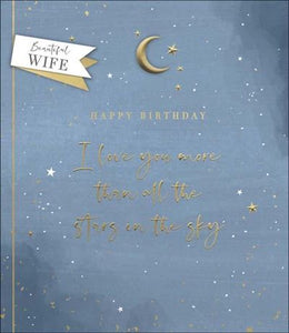 Show your wife how deeply she is loved. Mark her special day with this exquisite Wife birthday card adorned with a stunning moon and stars pattern and decorative attachments. Crafted from premium-grade board and eco-friendly paper, this card is sure to leave her feeling cherished!