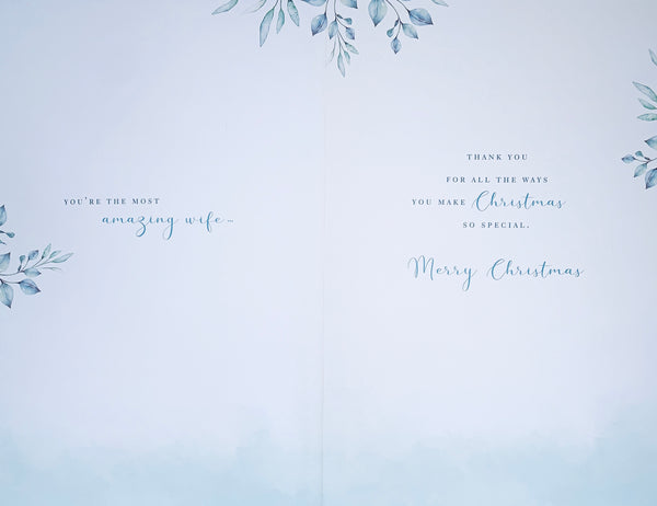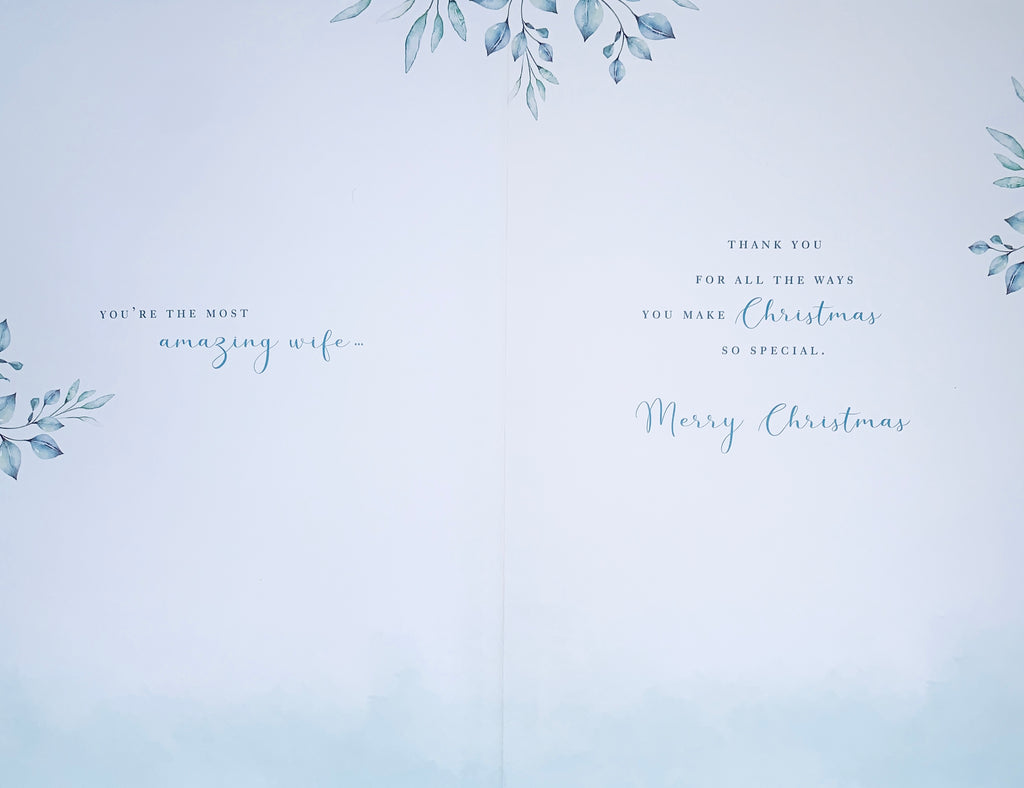 Wish your Wife a wonderful Christmas and let her know how special she is with this beautiful Wife Christmas card. This Wife Christmas card features a traditional design with a hot foil finish and decorative attachment with a full colour insert. This greeting card is printed on high quality board and designed in the UK.