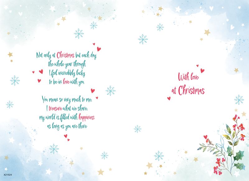 Not only at Christmas but each day the whole year through feel incredibly lucky to be in love with you. You mean so very much to me, I treasure what we share, my world is filled with happiness as long as you are there. With love at Christmas.